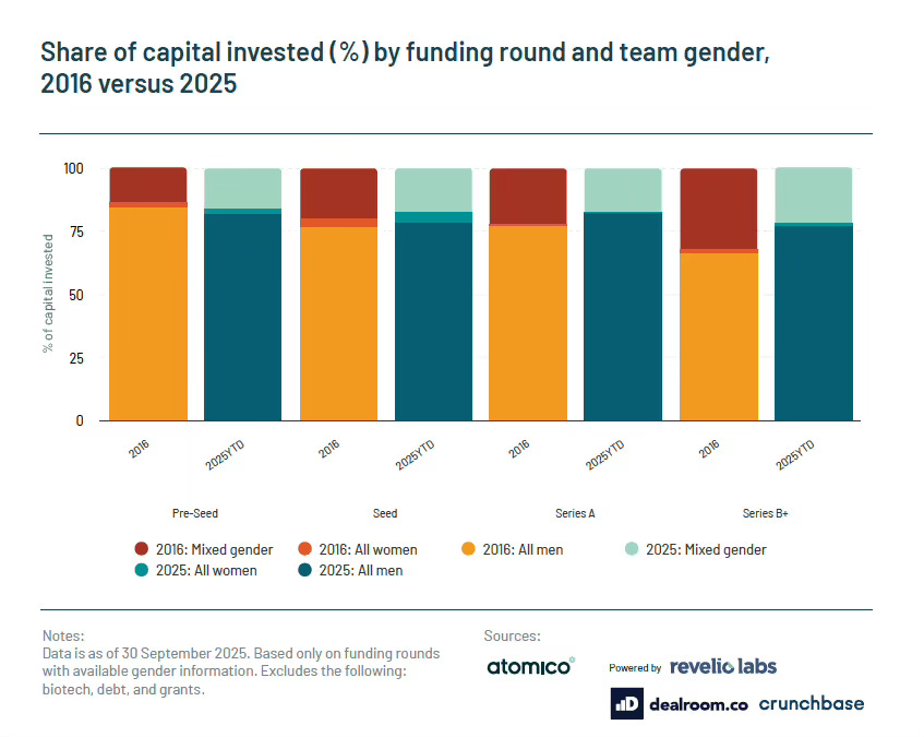 These teams receive a disproportionately small share of VC capital at every investment stage. Even mixed-gender teams, which historically captured 32% of Series B funding in 2016, saw their share drop to 22% by 2025.